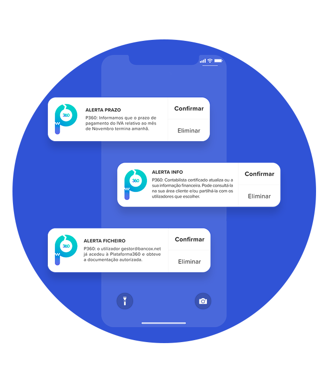 Sim, a P360 prevê disponibilizar aos utilizadores um conjunto de alertas que pode ser personalizado pelos utilizadores – para telemóveis ou e-mails – com datas limite de pagamento, de entrega de declarações, de disponibilização de relatórios.
